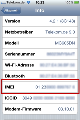 iPhone anschalten > Einstellungen > Allgemein > Info und dann IMEI