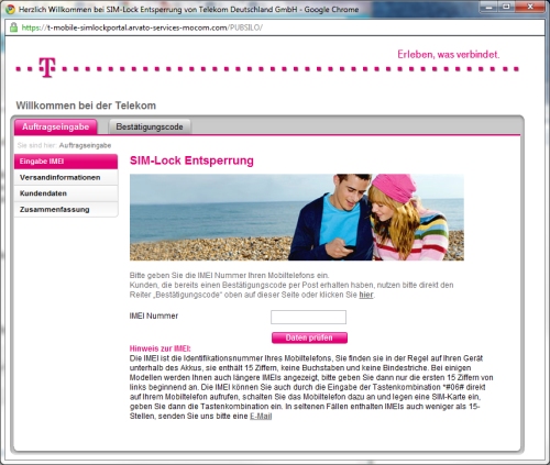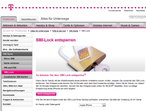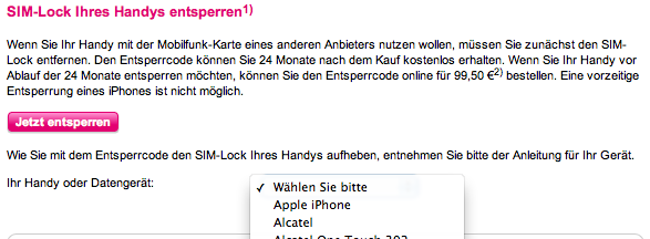 من هنا تجد موقع T-Mobile SIM-Lock entsprerren في نفس الصفحة ستجد كلمة Jetzt entsprerren و تعني فتح الجهاز اين كان , بجانب هذا الزر توجد قائمة باسماء التلفونات و كيفية فتحها من قبل الشركة . تجاهلها و اضغط فقط على كلمة Jetzt entsperren