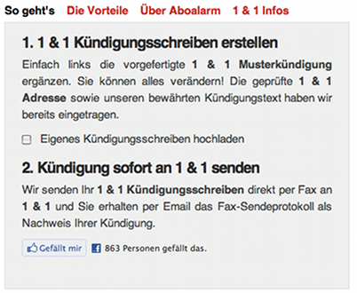هذا الموقع يعرض لك اولاً نوع الـ Kündigung  و بعد ذلك يظهر لك اسم الشركة و من ثم تتوجة الى صفحة الكتابة و هناك بامكانك مشاهدة نص طلب انهاء العقد و ما عليك الا ان تضيف اسمك , رقم العقد , تاريخ انهاء العقد و عنوانك . و بجانب تلك الرسالة ستشاهد عنوان و الذي سيتم ارسال الـ Kündigung اليه .